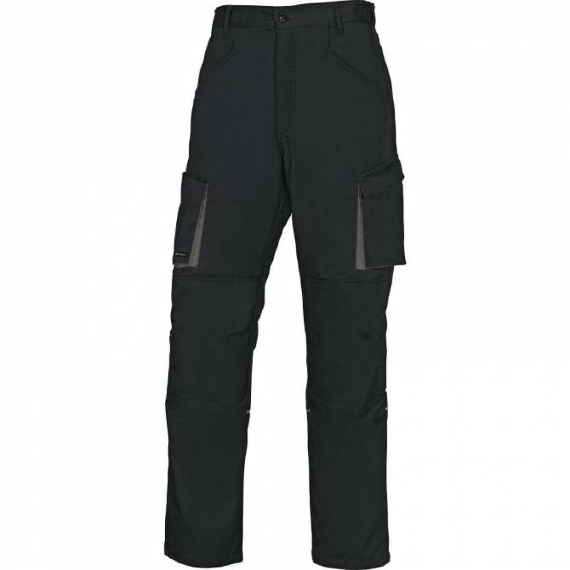 Ce pantalon de travail Delta Plus est conçu en polyester et en coton et dispose d’une taille élastique sur les côtés ainsi qu’une braguette fermée par un zip sous rabat.